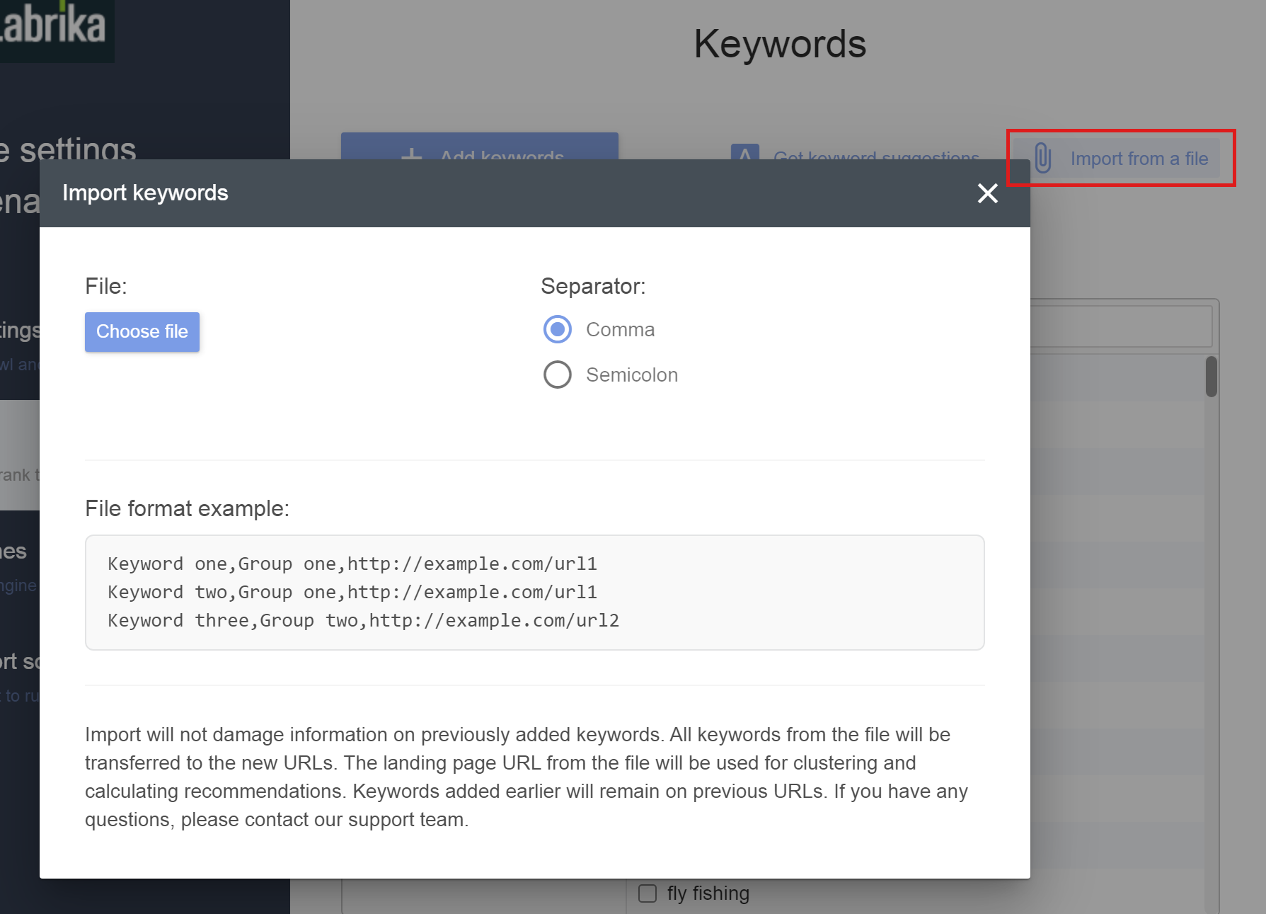 .CSV formatlı bir dosyanızı da yükleyebilirsiniz. Bu durumda üç sütunlu bir CSV dosyası oluşturulmalı ve Labrika otomatik olarak anahtar kelimeleri, istenen anahtar kelime sıralama grubu ve geliştirme sayfası URL'sini alacaktır - bu el ile anahtar kelimeleri eklemekten çok daha hızlı bir süredir.