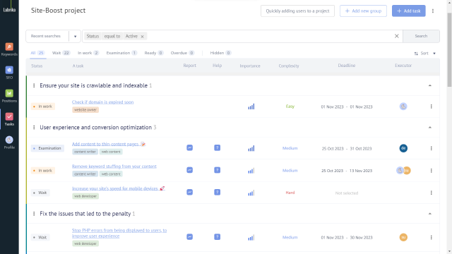 Labrika, sitenizin kapsamlı bir SEO analizi temelinde bir görev listesi içeren bir proje otomatik olarak oluşturabilir. Sitenizi optimize etmek ve performansını ve sıralamasını iyileştirmek için ne yapılması gerektiğini kolayca görebilirsiniz.